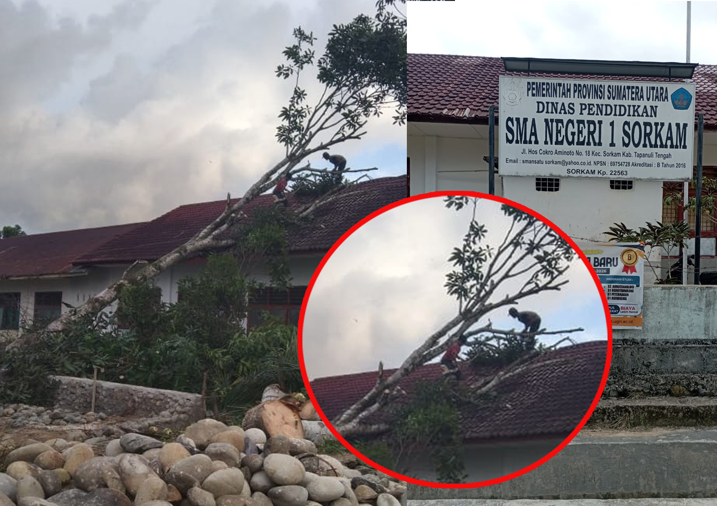 Sorkam (FoalNews.com) – Hujan deras disertai angin kencang yang melanda Kabupaten Tapanuli tengah pada tanggal 15 Nopember 2025 Lalu, menyebabkan sebuah pohon berukuran besar tumbang dan menimpa dua atap ruang kelas di SMA Negeri 1 Sorkam. Beruntung, tidak ada korban jiwa dalam kejadian tersebut, meski para Siswa- siswi dalam ruangan kondisinya sedang belajar saat kejadian berlangsung.